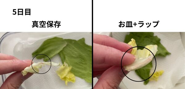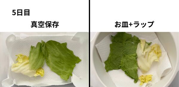 5日目ぐらいから明らかに『お皿+ラップ』で保存したレタスの葉がしなしなになっているのがわかります。